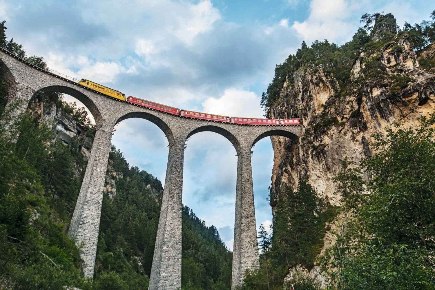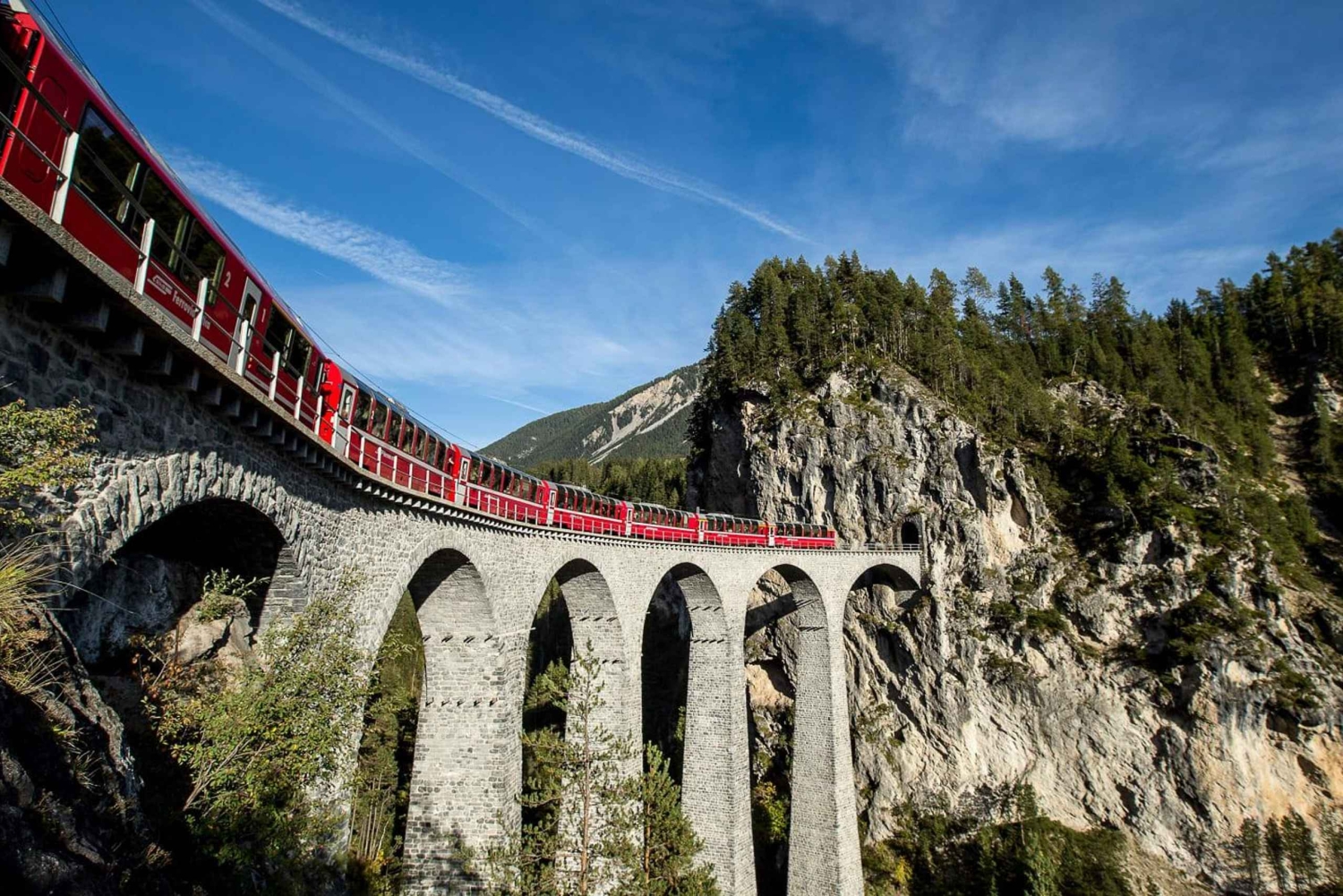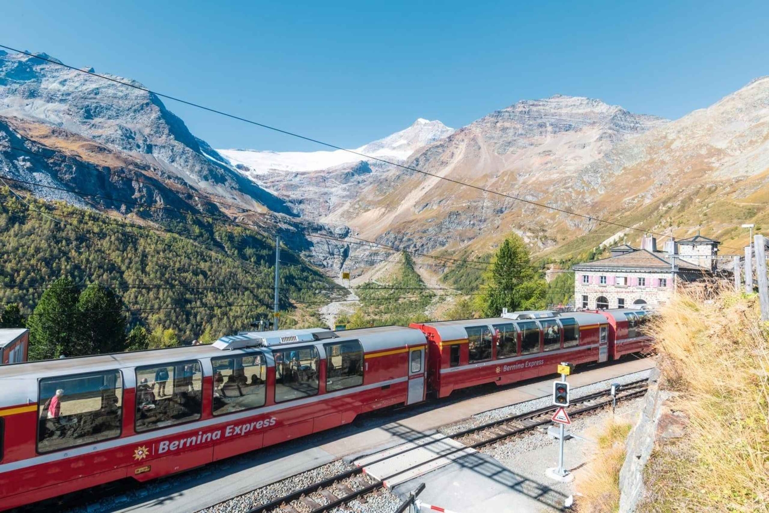 - Entspanne dich im berühmten roten Zug Bernina Express inmitten der Schweizer Alpen