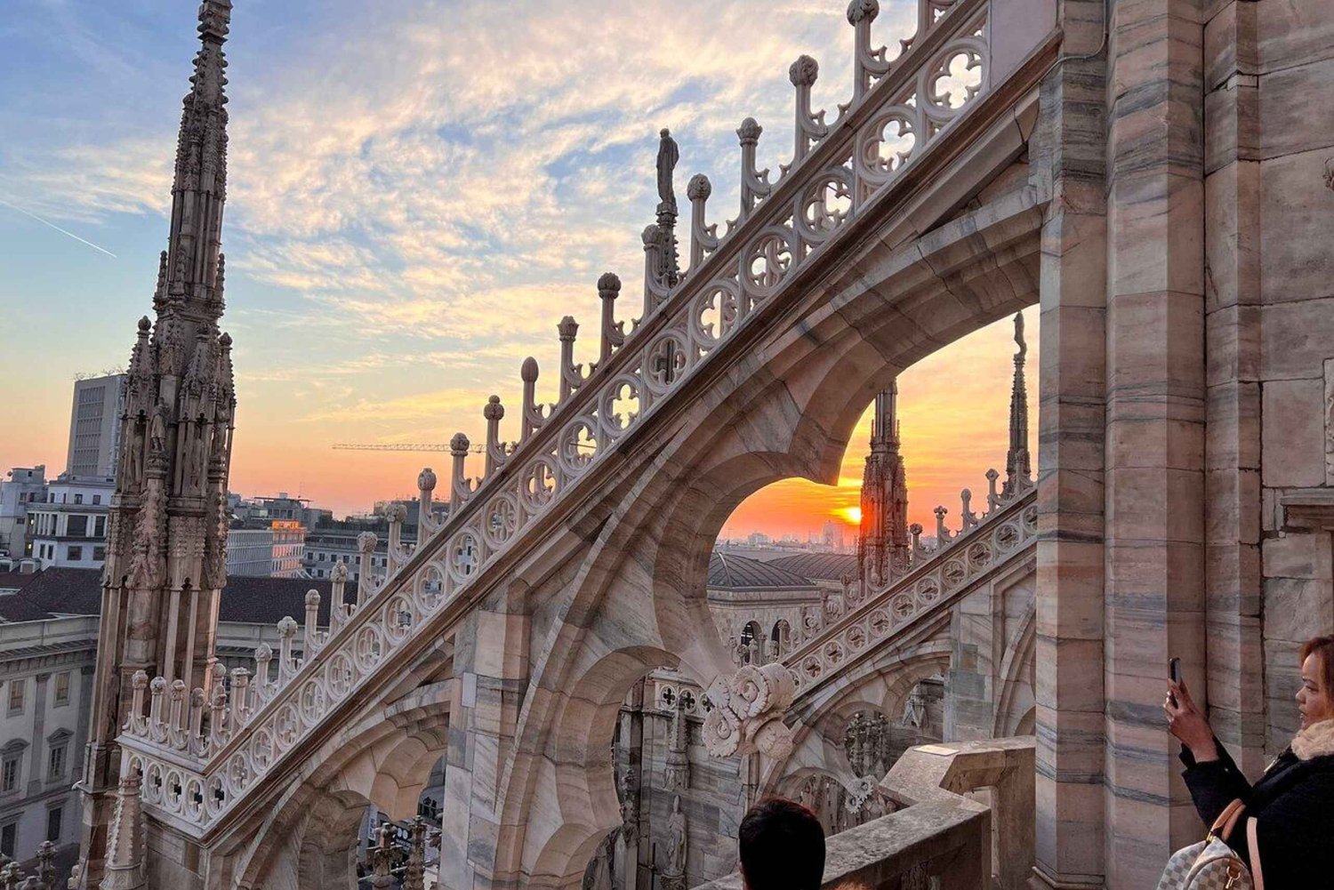 278 レビュードゥオーモのテラスまで行く優先入場ツアーで、ミラノを上から眺めましょう。壮大な大聖堂の屋根の上を歩く忘れられない体験をお楽しみください。大聖堂、ミラノ、時にはアルプスの景色も堪能できます。