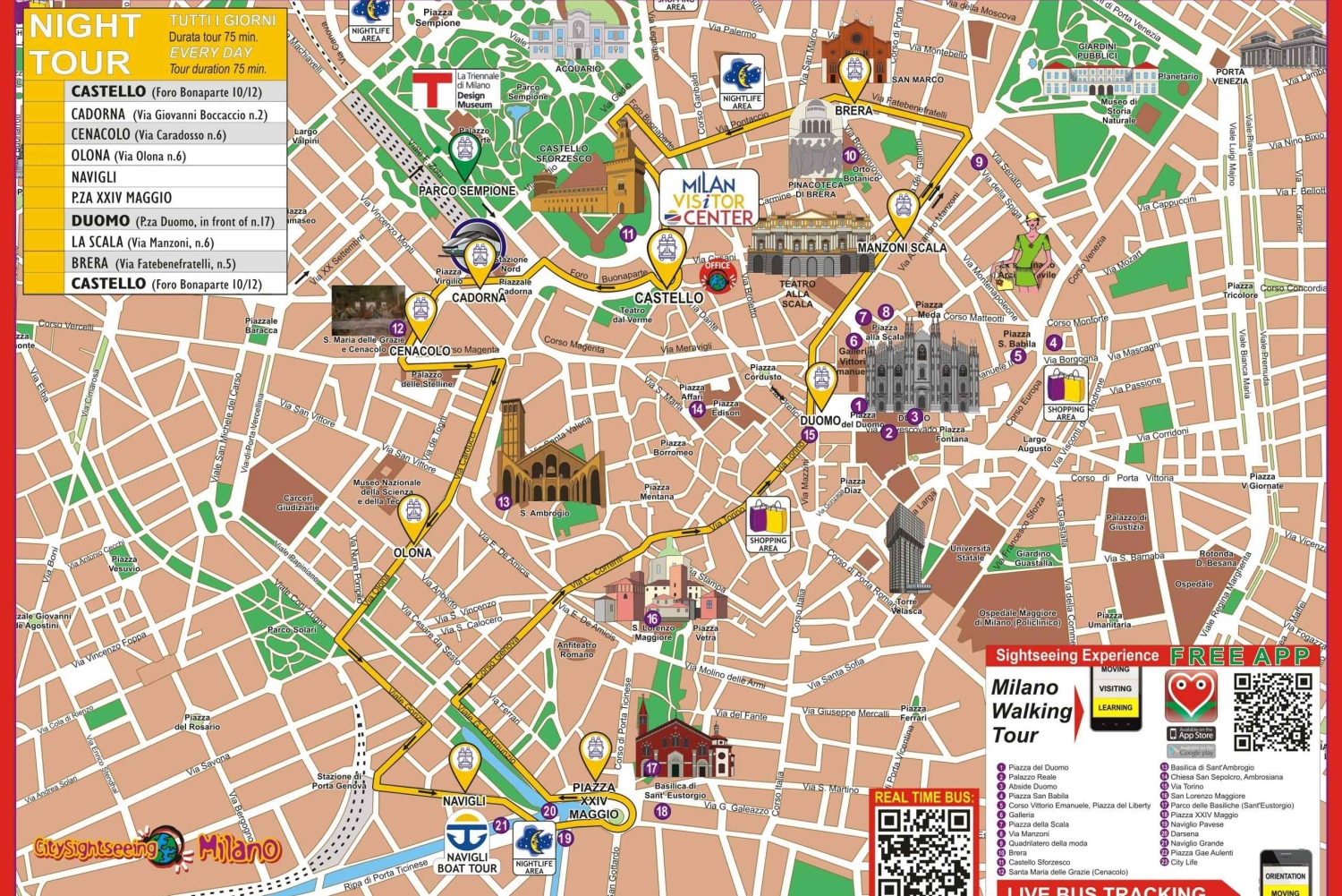 Utforska Milanos livliga själ under stjärnorna med en spännande kvällstur. Hoppa ombord på en bekväm buss och låt dig transporteras på en spännande resa genom de upplysta gatorna i staden, medan du utforskar några av dess mest ikoniska och fascinerande platser. Fördjupa dig i den majestätiska atmosfären i en av Milanos mest emblematiska symboler, Sforza-slottet. Beundra dess storslagenhet och förflyttas tillbaka i tiden när du lär dig om historien och legenderna som omger denna magnifika fästning. Fördjupa dig i den livliga atmosfären i Navigli, de pittoreska kanalerna som ger Milano sin unika karaktär. Korsa de pittoreska broarna och beundra ljusen som reflekteras i vattnet när du utforskar detta bohemiska kvarter, känt för sina restauranger, barer och konstbutiker. Beundra Duomo di Milano, en av de mest extraordinära gotiska katedralerna i världen, när den står majestätiskt i hjärtat av staden. Passera den prestigefyllda Teatro alla Scala och det berömda Brera-distriktet, fördjupa dig i den kulturella atmosfären i Milano och upptäck operans och konstens hemligheter.Includes